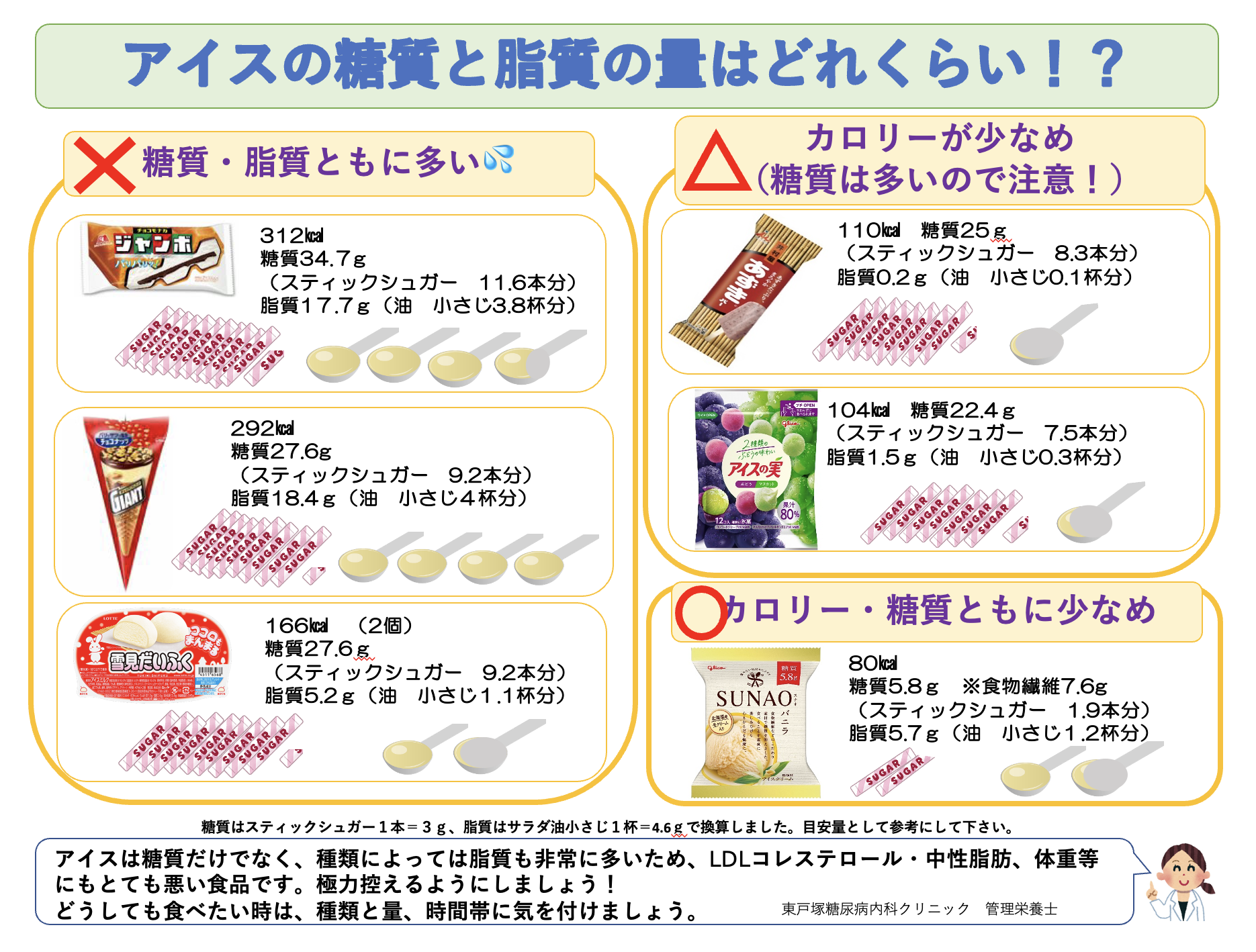 暑いと特に食べたくなるアイスですが、糖質が非常に多いため血糖値を急上昇させるだけでなく、種類によってはLDL-コレステロール値にもとても悪いため、極力控えましょう。