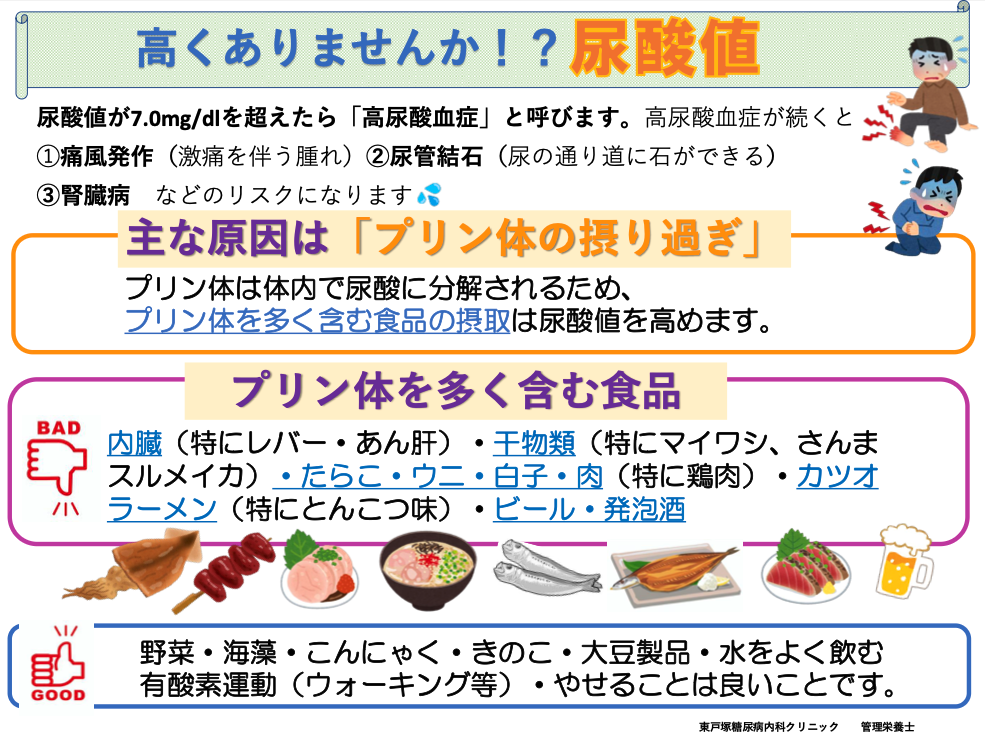 意外と意識していない方が多い「尿酸値」ですが、高値が続くと痛風発作、尿路結石、腎機能悪化などの原因となります。尿酸値を抑えるためには「プリン体が多い食品」を参考に気をつけましょう。